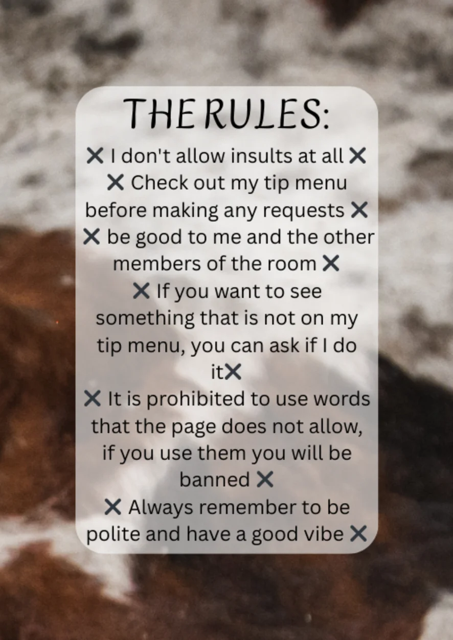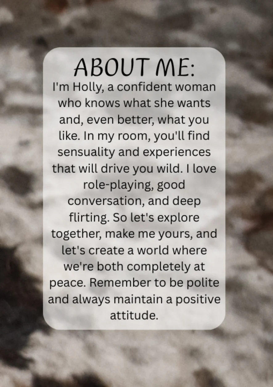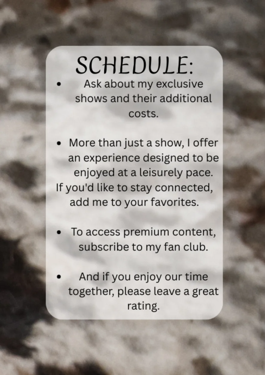 에로틱 댄스, 스트립쇼, 딥스로트, 상의탈의, 하이힐, 트월킹, 블로우잡, 자위, 아헤가오, 스팽킹, 카멜토우, 자지 평점, 풋 페티시, 마사지, fitness, saliva, 스트랩온, 크림파이, 핑거링, 딜도 또는 바이브레이터, 음란한 대화, 굴욕, 섹스 기구, 도기 스타일